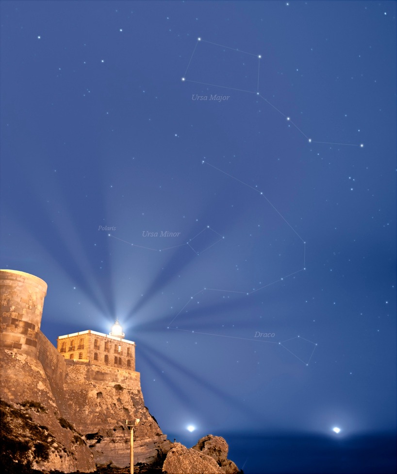 Faro Melilla. Abril 2008. Canon EOS 400D. Sobre trípode fotográfico sin seguimiento. Objetivo Canon 18-55. Constelaciones Osa Mayor, Osa Menor y Dragón. Leandro Banegas Gomariz.