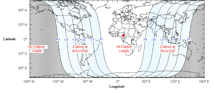 El siguiente mapa muestra las regiones desde las cuales fue posible ver el eclipse. En gris, las zonas que no observaron el eclipse; en blanco, las que si lo presenciaron; y en celeste, las regiones que pudieron ver el eclipse durante la salida o puesta de la Luna.