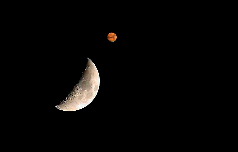Fotomontaje en el que marte presenta un tamaño mayor del real en comparación con la luna. Se trata de una conjunción entre la luna y marte.