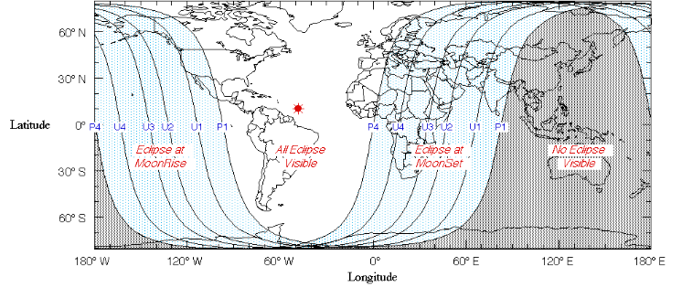 El siguiente mapa muestra las regiones desde las cuales fue visible el eclipse. En gris, las zonas que no presenciaron el eclipse; en blanco, las que si lo hicieron; y en azul, las regiones que observaron el eclipse durante la salida o puesta de la luna.