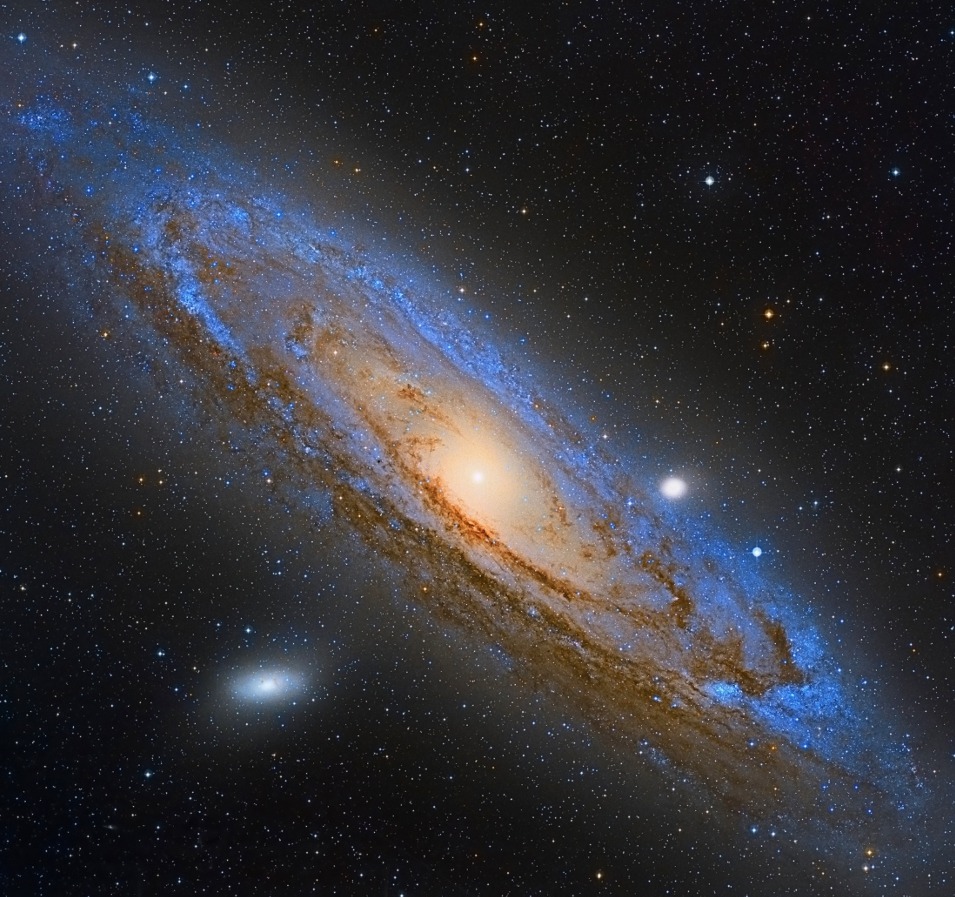 La galaxia de Andrómeda, también conocida como Galaxia Espiral M31, Messier 31 o NGC 224, es una galaxia espiral gigante con un diámetro de doscientos veinte mil años luz y que contiene aproximadamente un billón de estrellas.4 Es el objeto visible a simple vista más alejado de la Tierra (aunque algunos afirman poder ver a simple vista la Galaxia del Triángulo, que está un poco más lejos). Está a 2,5 millones de años luz (775 kpc)2 en dirección a la constelación de Andrómeda. Es la más grande y brillante de las galaxias del Grupo Local, que consiste en aproximadamente 30 pequeñas galaxias más tres grandes galaxias espirales: Andrómeda, la Vía Láctea y la Galaxia del Triángulo. La galaxia se está acercando a nosotros a unos 300 kilómetros por segundo,5 y se cree que de aquí a aproximadamente 3.000 a 5.000 millones de años podría colisionar con la nuestra y fusionarse ambas formando una galaxia elíptica supergigante.